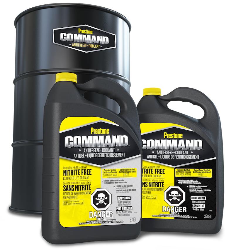 L’antigel + liquide de refroidissement vie prolongée sans nitrite service intensif Prestone CommandMD est conçu pour tous les véhicules des classes 1 à 8 : utilitaires lourds et légers. Il est compatible avec tous les véhicules, toutes les couleurs de liquide de refroidissement et tous les moteurs TAO sans nitrite.